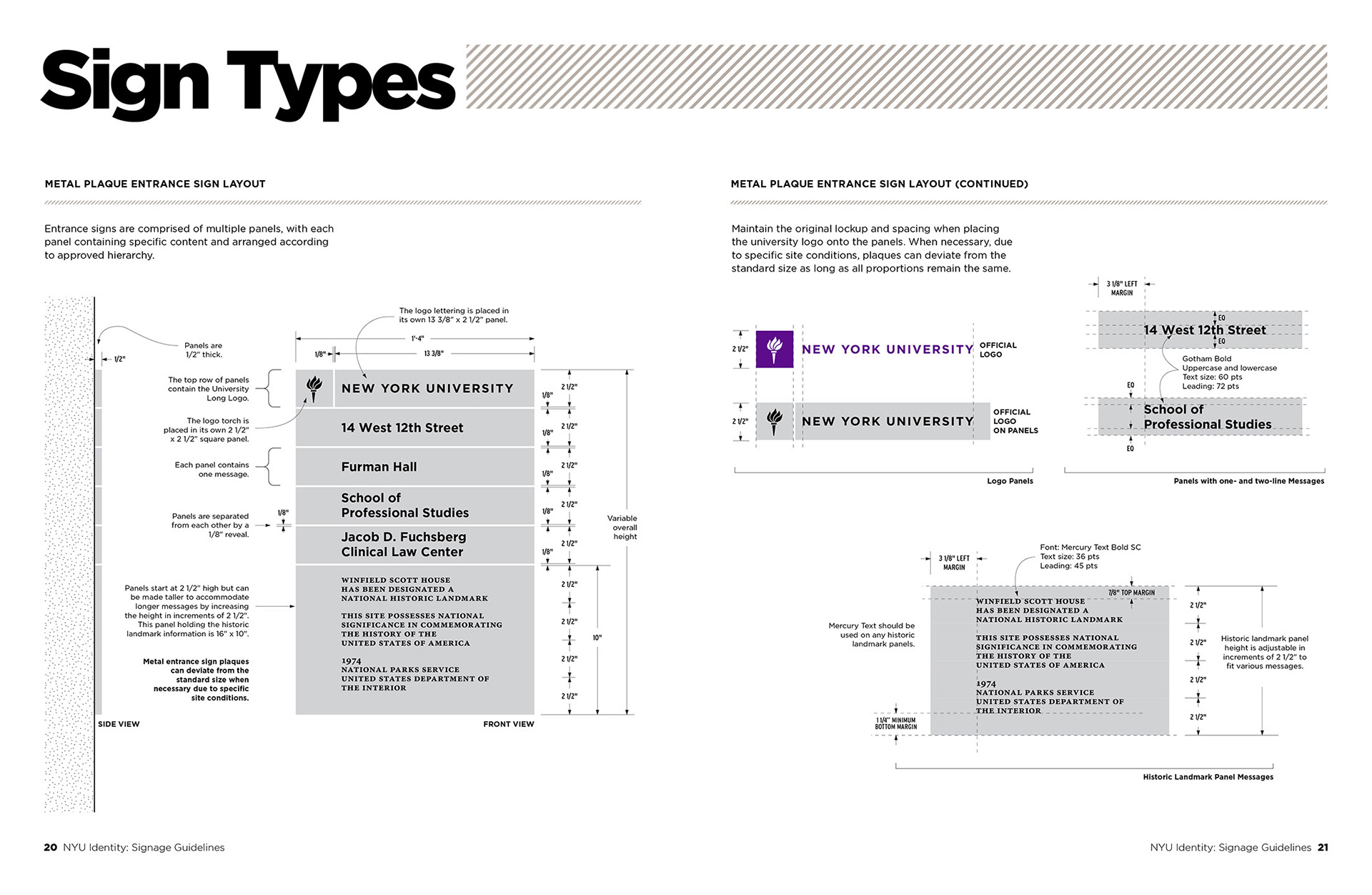As a leading academic institution with locations across the globe, NYU must express a clear and consistent visual identity across all media and communications. Consistent use of the University’s branding creates unified messaging and reinforces the collective value of the institution. As part 6 of an expansive series of identity manuals, Michael designed and developed NYU’s Exterior Signage Guidelines. These guidelines ensure the success of branded exterior signage and coordinated wayfinding systems that help students navigate campuses and find destinations more easily. This manual provides approved graphic elements, materials, and fabrication guidelines for all standard exterior signage, including flags, banners, entrance signs, and campus maps. It covers graphic elements such as typography, color, logo placement, and message hierarchy, and defines sign type specifications, graphic layouts, conventions, and architectural implementation. Designed by Via Collective, Inc., the design firm of record.