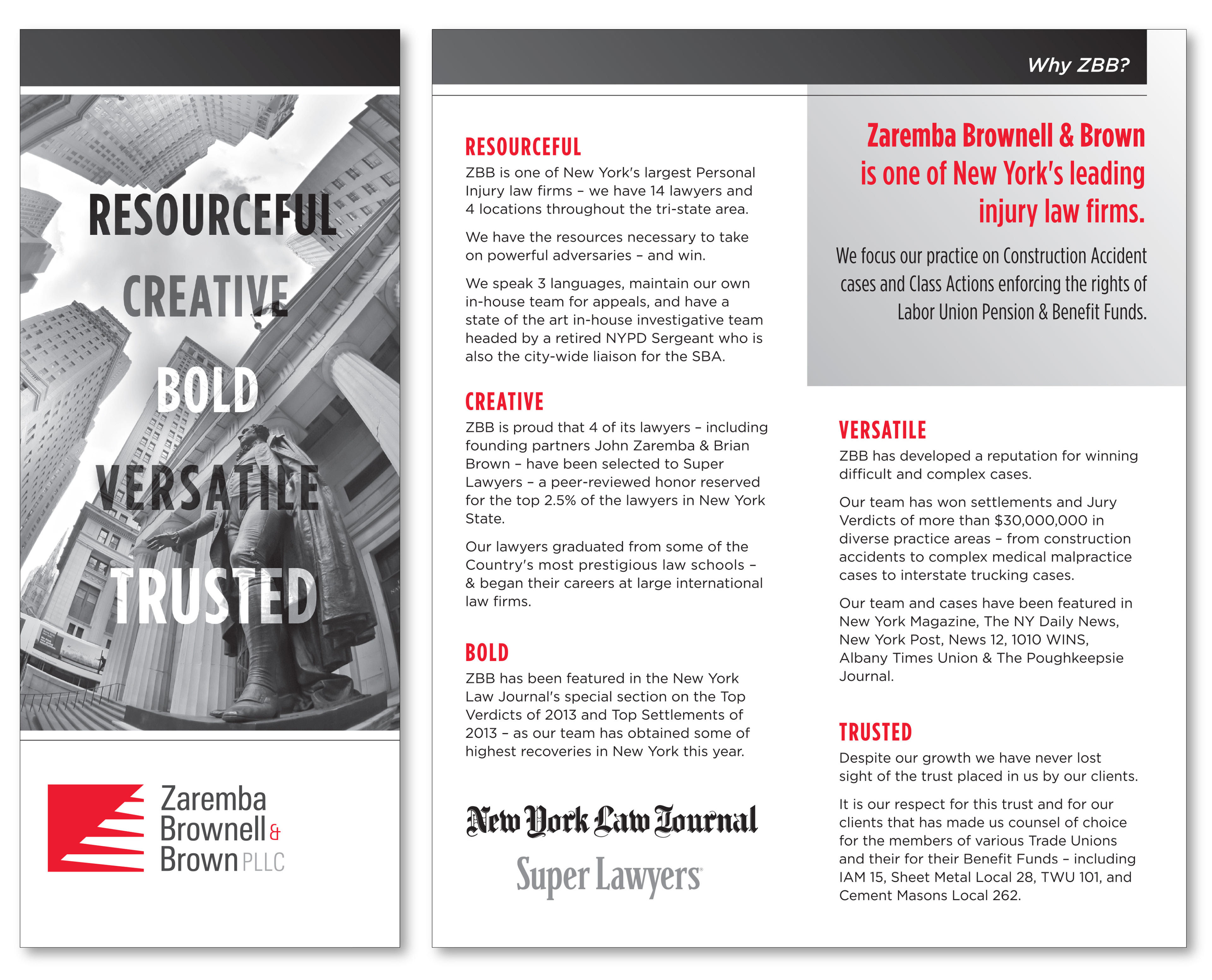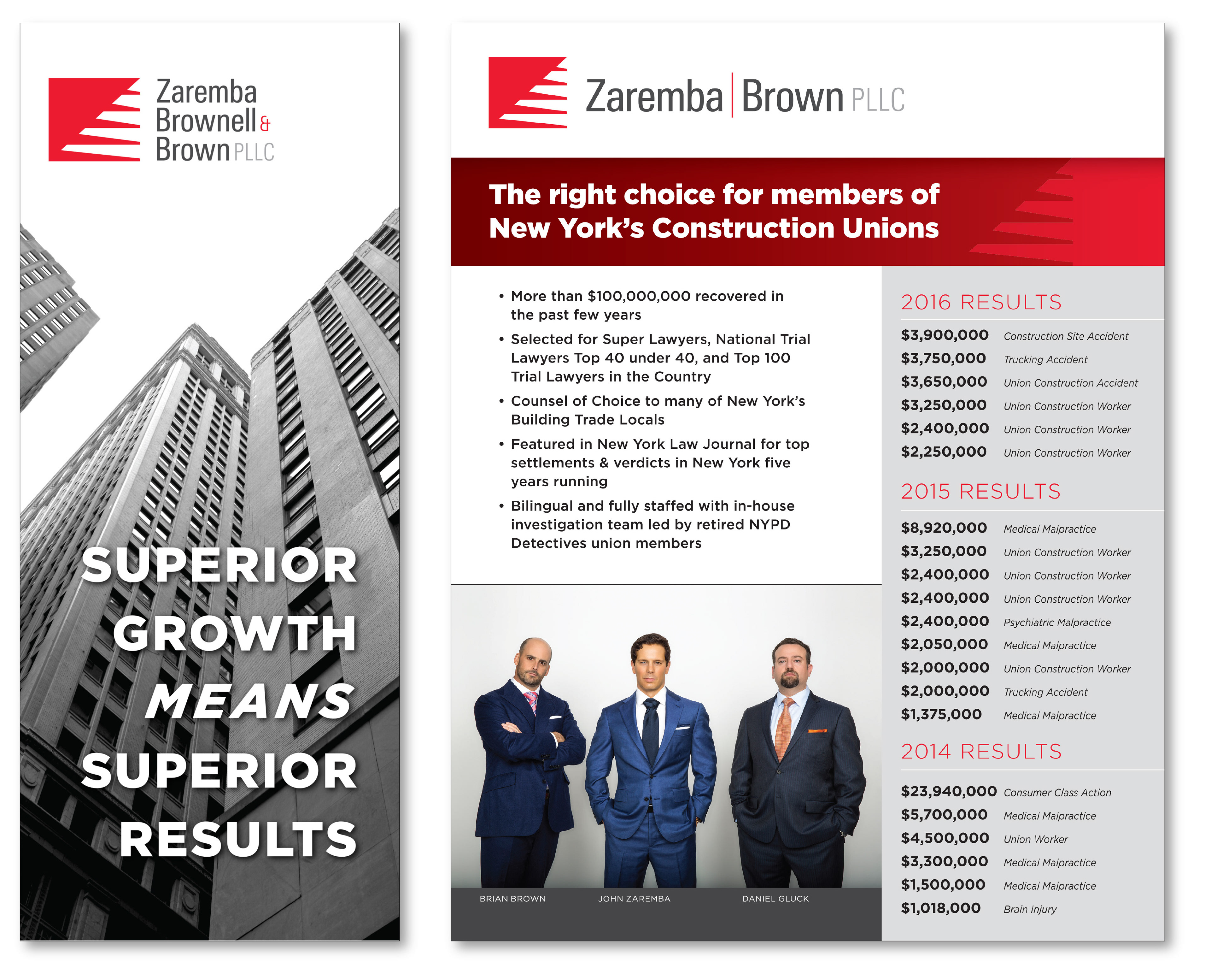 Zaremba Brown, PLLC is a trial and litigation law firm providing aggressive yet creative legal counsel for high stakes cases and class actions involving the construction trade. Based loosely on an abstracted “Z” this logo uses an aggressive red hue, bold stripes and ascending angles to emphasizes action, growth and results.